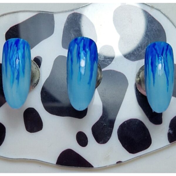 Choose three blue gel polish shades of various intensities, and paint the lightest one over the entire nail. Cure, then choose the slightly darker shade and use a fine liner brush to paint wavy lines from the cuticle area towards the centre of the nail. Cure, then repeat with the darkest blue shade and cure again.