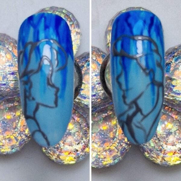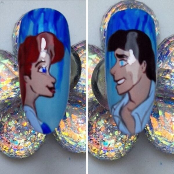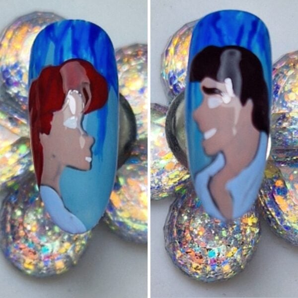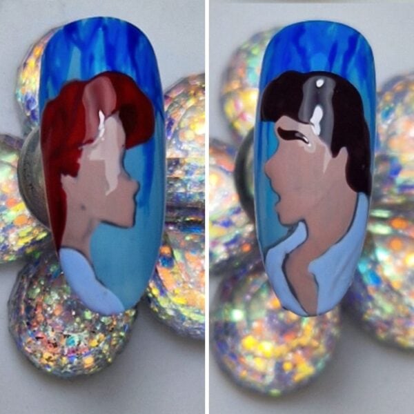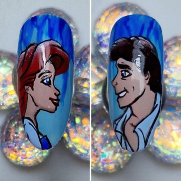 I chose a nude gel polish shade for the skin tones, a dark brown for Eric’s hair, a warm red for Ariel’s hair and a light blue for their clothing. Paint within the lines, curing between each colour application to prevent the colours from bleeding.