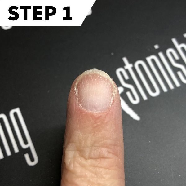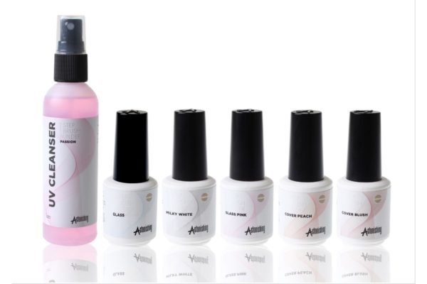 Remove dust and apply a thin coat of Astonishing Glass Pink 1 Step Brush Builder and cure for 60 seconds. Wipe with Astonishing UV cleanser and apply Super Shine for a high shine finish.