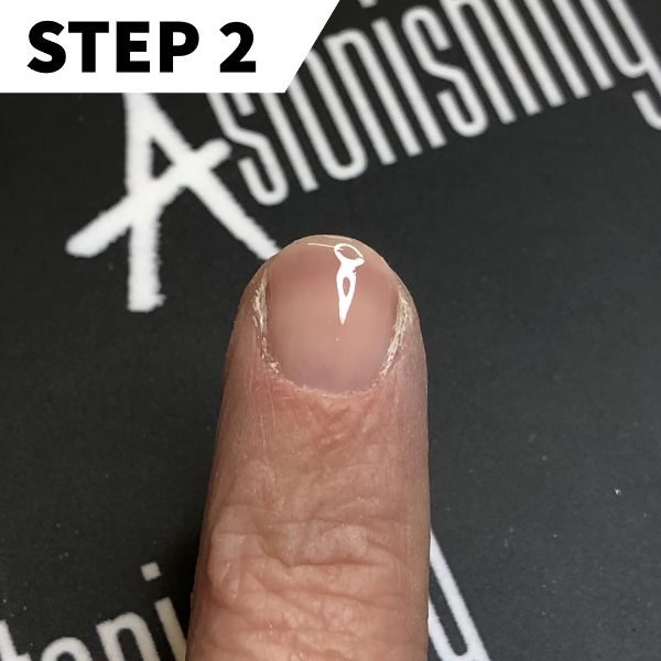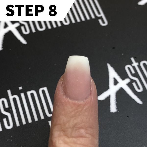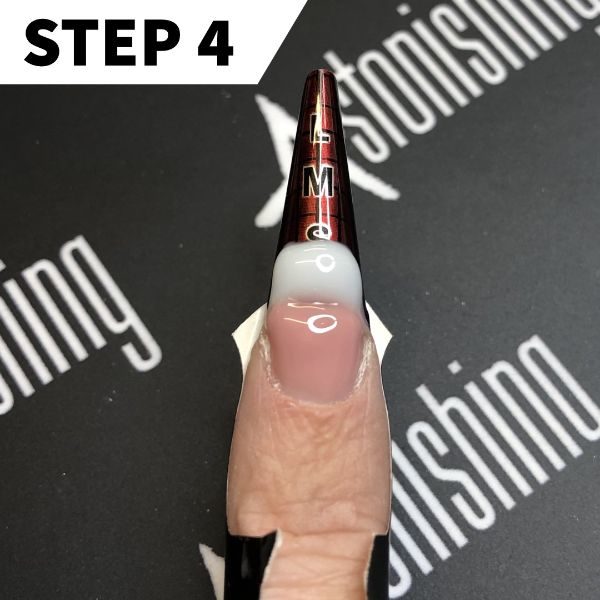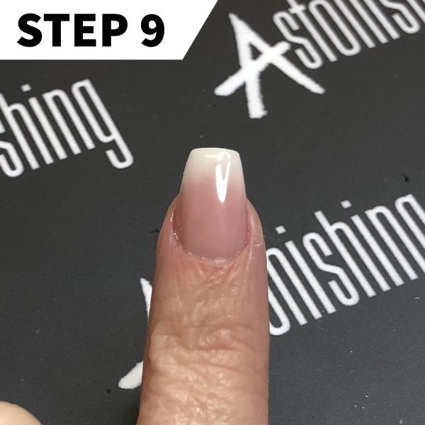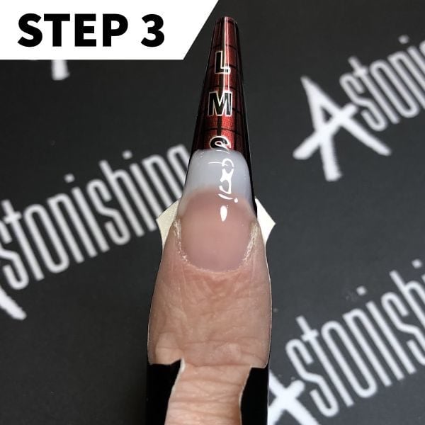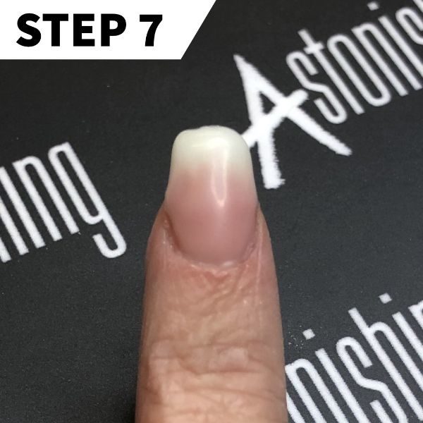 Apply a form and use the Astonishing Nails Milky White 1 Step Brush Builder to create the desired tip. Cure for 30 seconds.