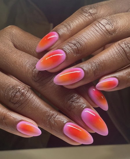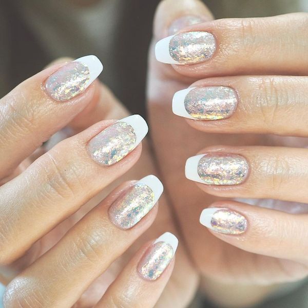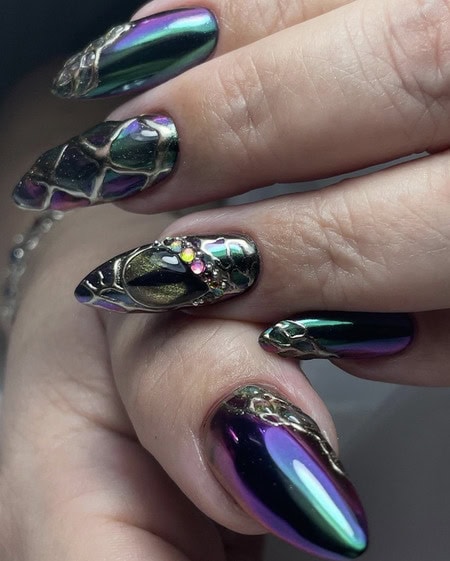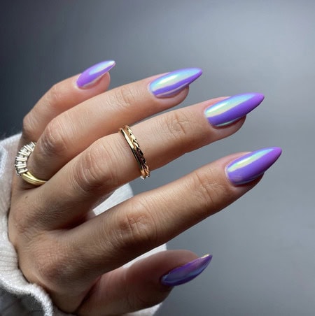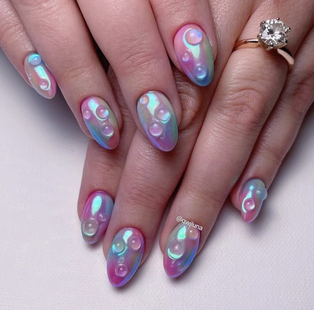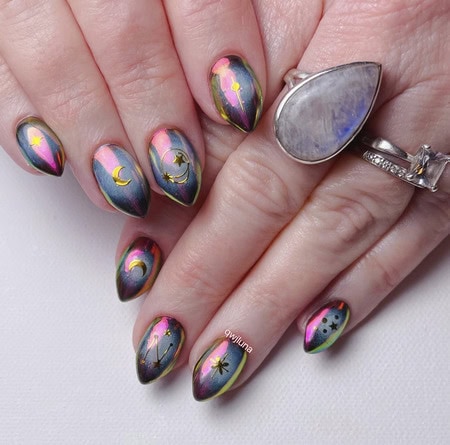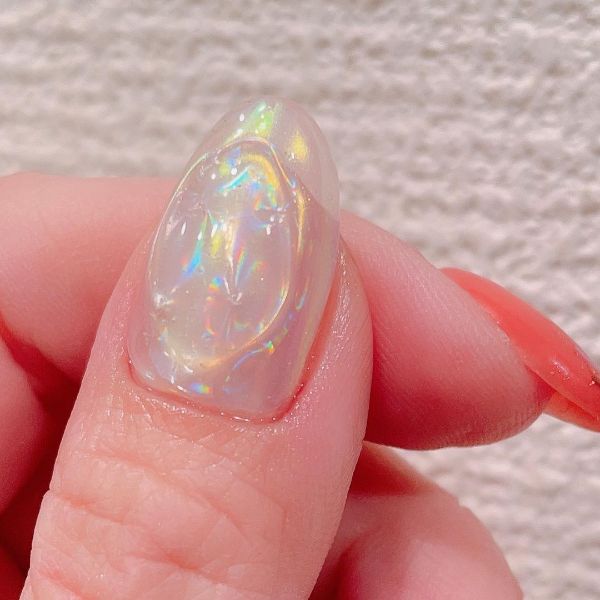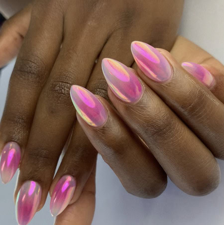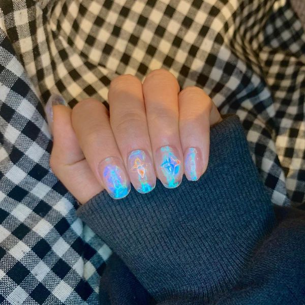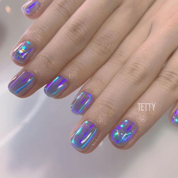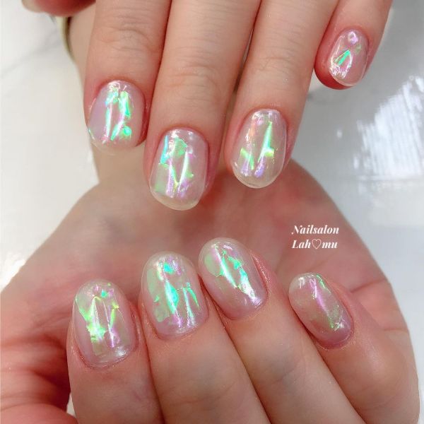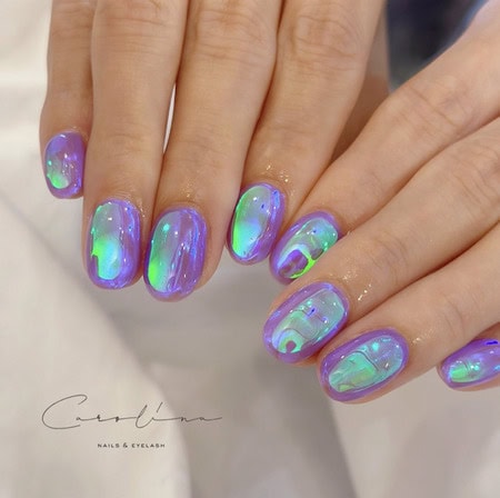 Dazzle and delight with nail designs inspired by the Aurora Borealis or Northern Lights, featuring shimmering shades and a glossy, glazed finish.