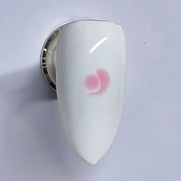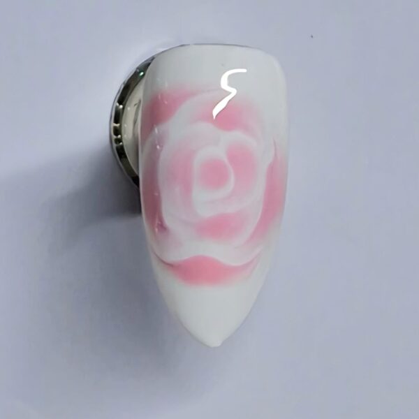 Continue to add curved pink gel polish shapes around the centre of the rose to build petal layers. Apply softly and ensure they are spaced out, as the blooming gel will spread them. Wait between five and 20 seconds for the blooming gel to work its magic. If the design is blooming too much, cure sooner; if it’s not blooming enough, give it a few more seconds. Cure once you are happy with the look.