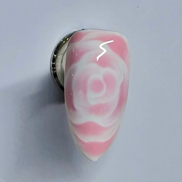 Apply a thin, even coat of blooming gel over the entire nail. Do not cure. Using a fine liner brush, add a dot of pink gel polish to the centre of the nail. Then, add a C-like curve of pink gel polish on the right-hand side of the dot to complete the middle of the rose. Do not cure.