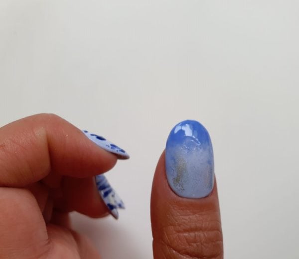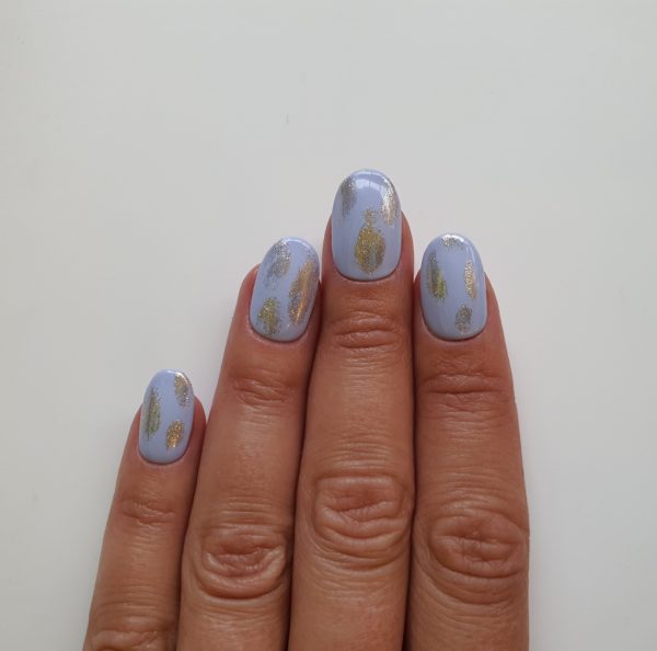 The next step is to take a small sponge and apply small strokes of Gellux Silver Chrome Mirror Powder Randomly over all of the nails.