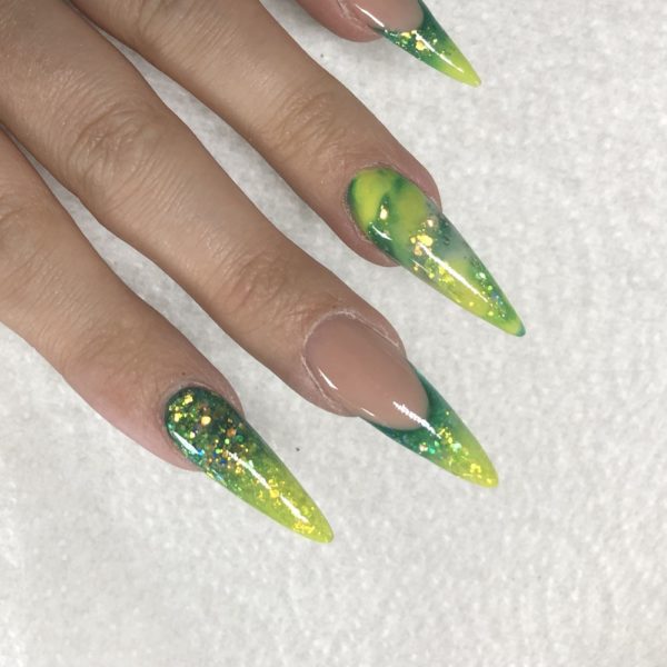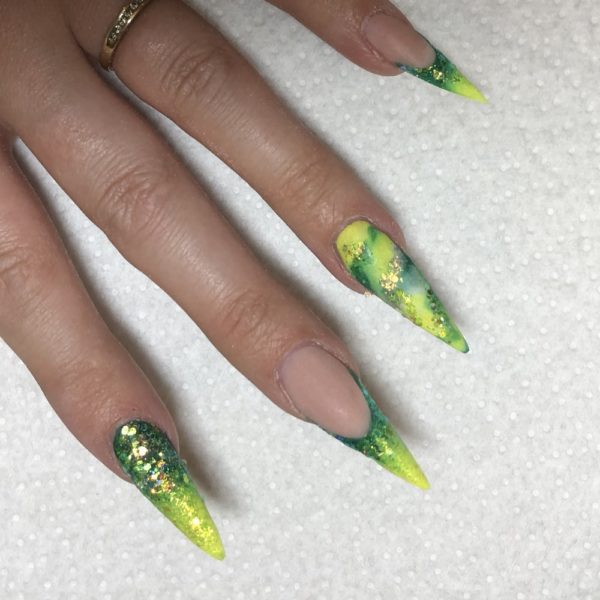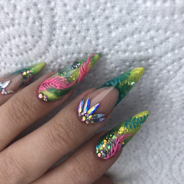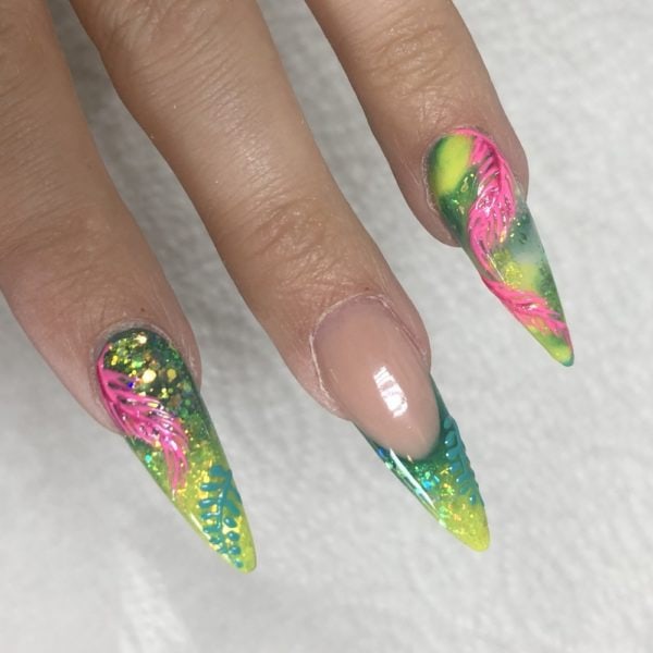 Using Akzentz Gel Play in Hot Pink and Teal, paint feather and leaf designs randomly over the nails. Cure and cleanse.