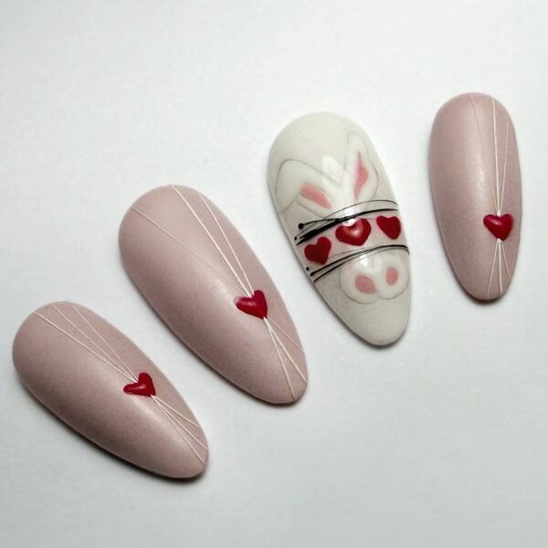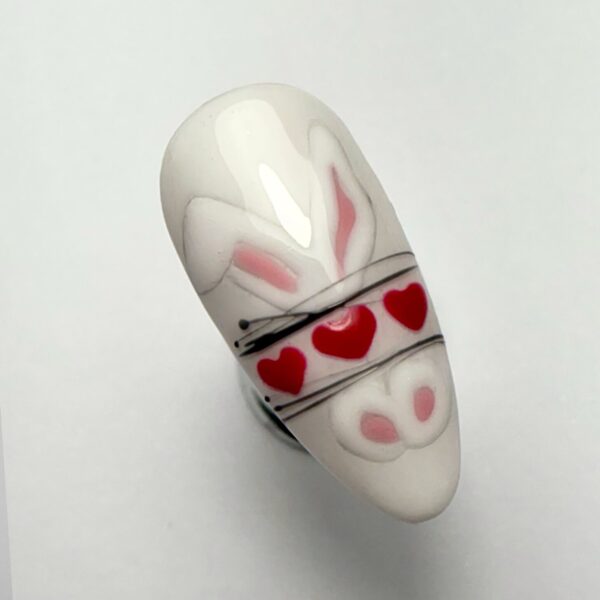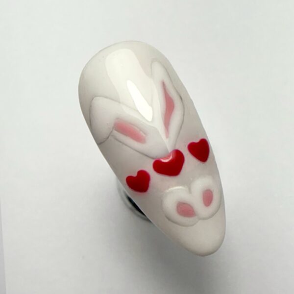 Using a clean Nail Art Brush Mini 000 and Andreia Professional Gel Paint in 06 Red, paint three hearts horizontally across the nail, between the bunny ears and paws. Cure for 60 seconds.