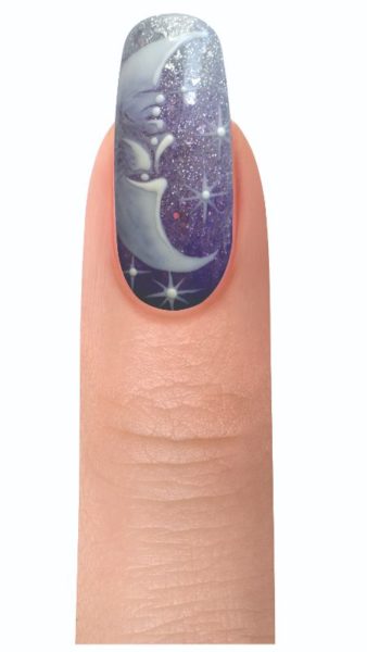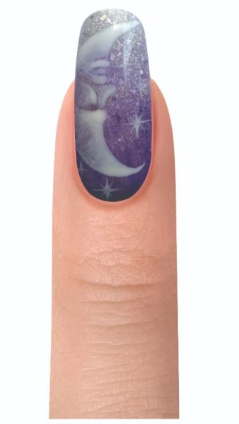 Highlight the moon and stars with Arctic Freeze. Cure for 30 seconds. With Nail Surface Cleanse and Wipe it Off lint-free wipes, cleanse the inhibition layer of the nail. Finish your look by massaging Nourish Cuticle Oil into the skin surrounding the nail plate.