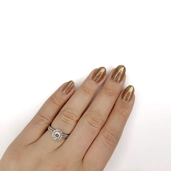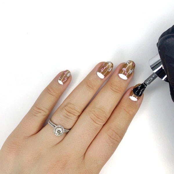 Apply Artistic Glossing Gel Top Coat and wipe off the tacky layer with Artistic Nail Surface Cleanser. Finish with Revive Cuticle Oil.