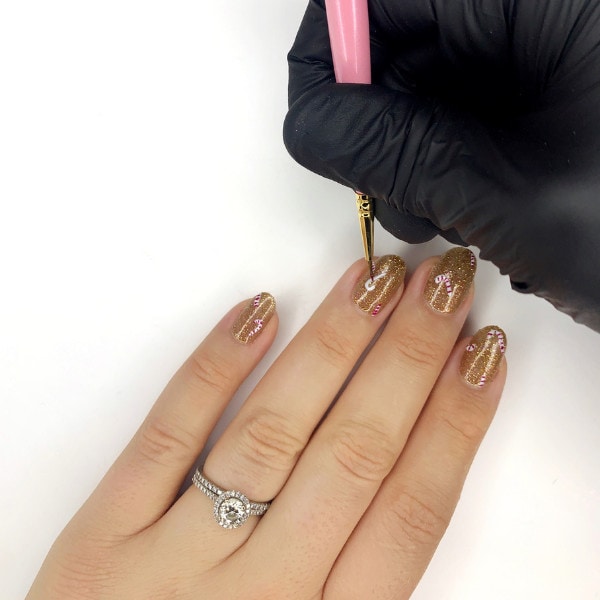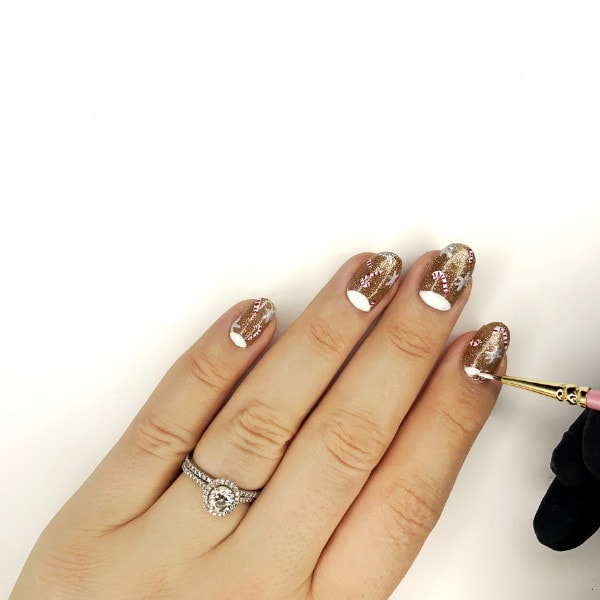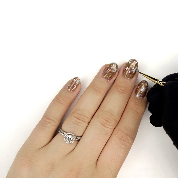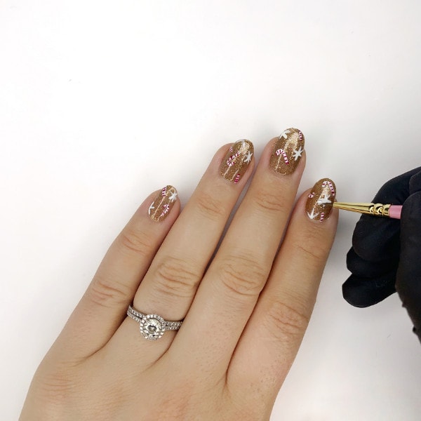 Using the Artistic Striper Brush, paint small candy cane shapes in all directions with Artistic Colour Gloss in Bride. Cure for 30 seconds.