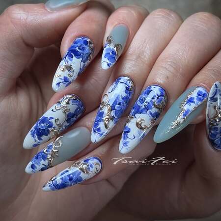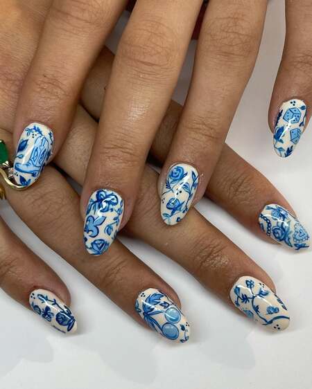The elegant motifs often feature florals, landscapes and delicate filigree, and have been a symbol of refinement for centuries. Now, nail pros are stepping up to embrace the aesthetic, recreating the patterns on nails using hand-painting and stamping techniques. Take a look at some of our favourite styles from Instagram…