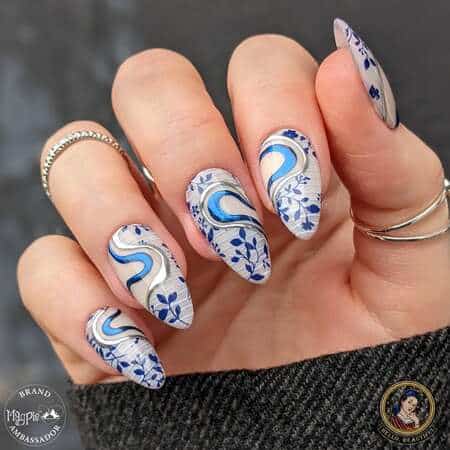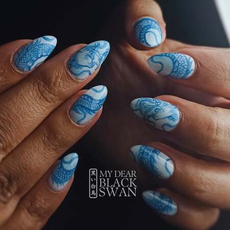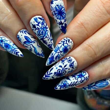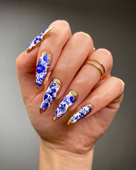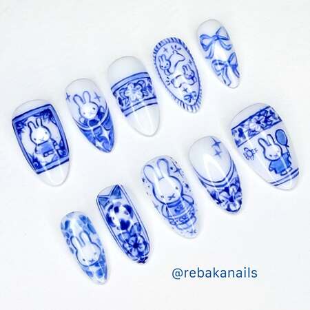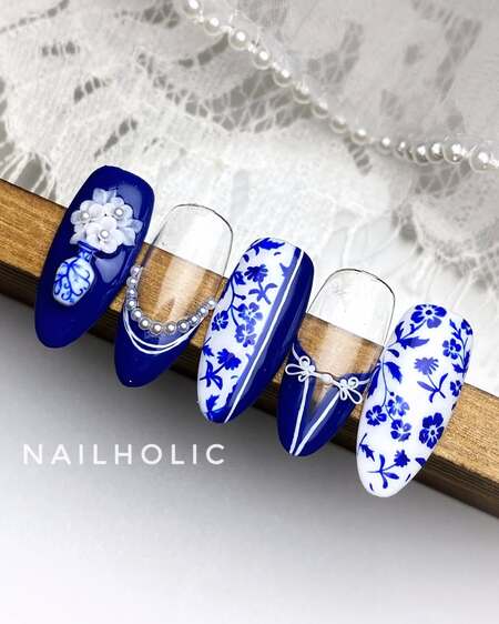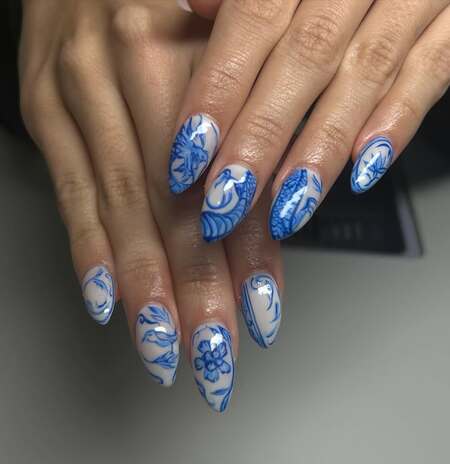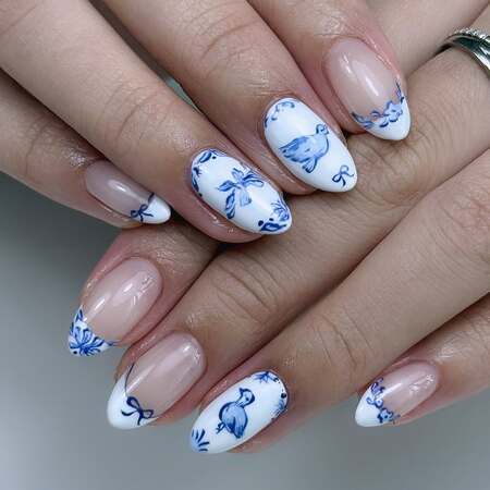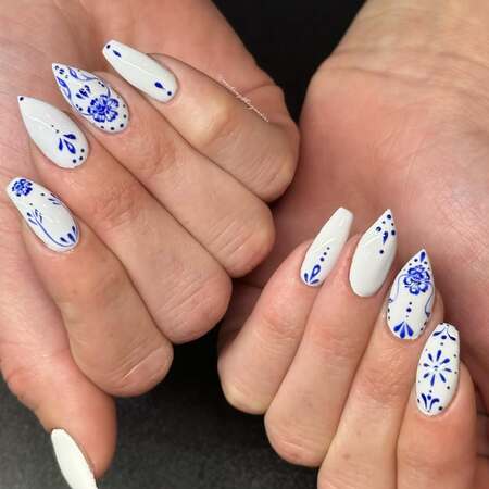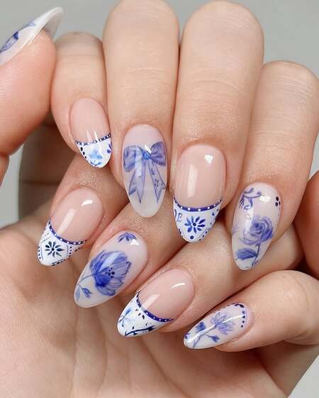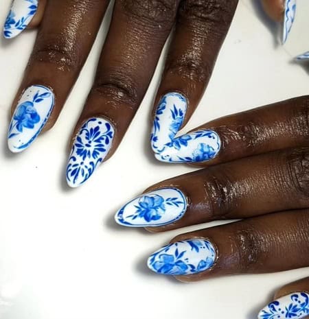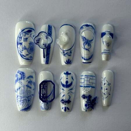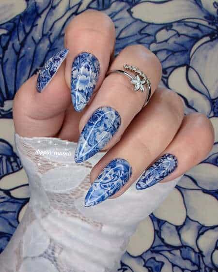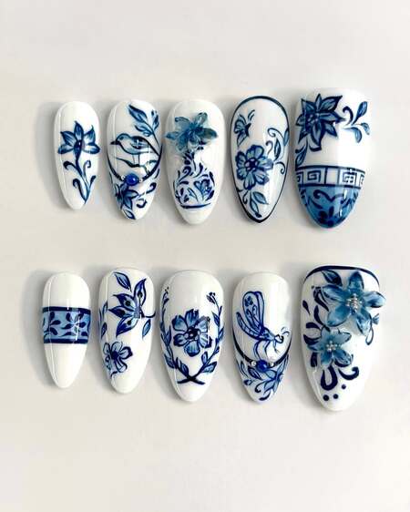 Porcelain or china-inspired nail art captures the delicate beauty of traditional blue and white ceramic patterns, often inspired by Ming dynasty porcelain.