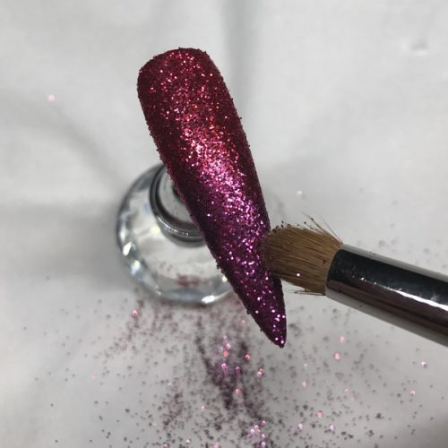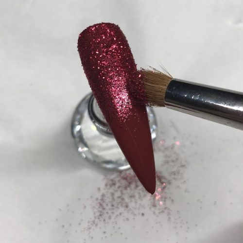 Dust away the excess glitter. Top coat the entire nail and cure.