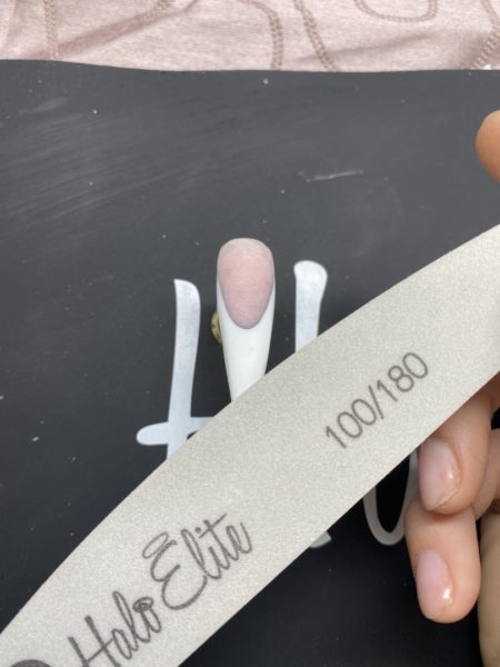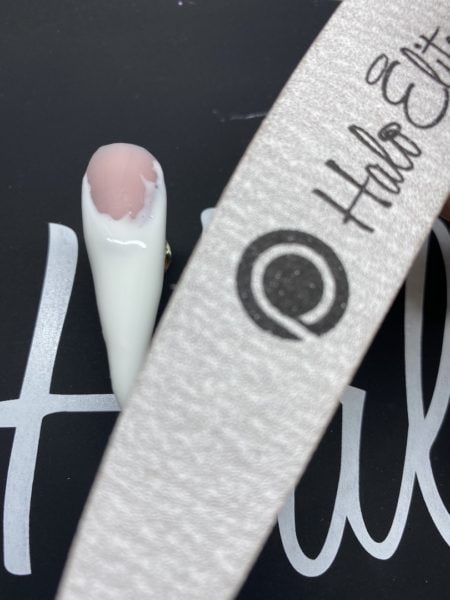 With a Halo Elite File, sharpen the smile line. Cure for 60 seconds.