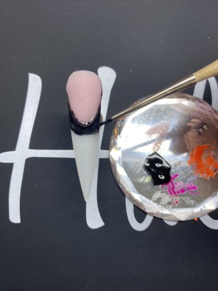 With Halo Gel Polish in Black, go around the smile line and ensure all of the wall is covered. Don't worry if you go over onto the base. Cure for 30 seconds and repeat.