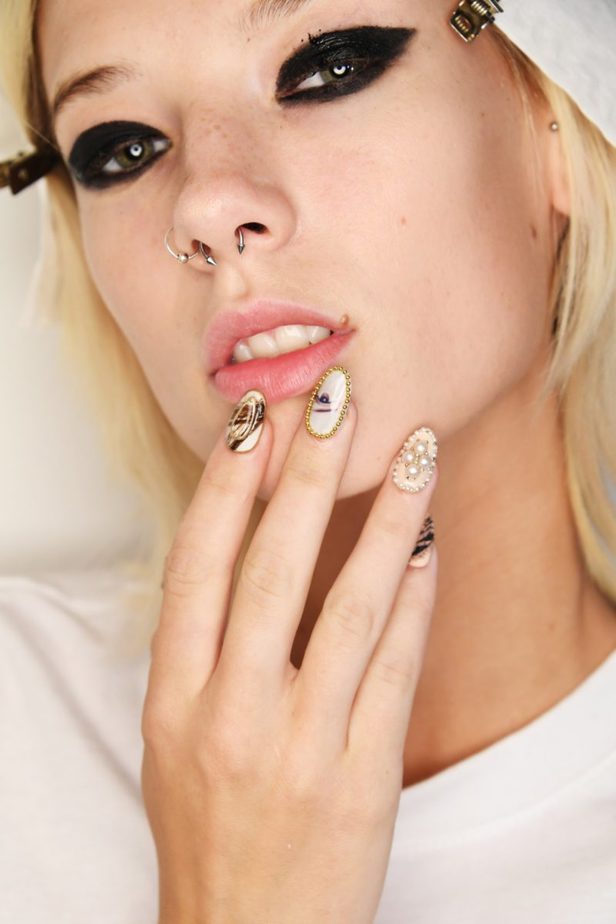 CND VINYLUX™ was used, with key shades including Studio White and Vintage. One of the standout nails was the ‘braided love lock’. In Victorian days, lovers wore ‘tokens of love’; jewellery incorporating hair from their lovers to keep them close. Heather braided fine locks of hair finished with a caviar bead frame on the nail to translate Johnson’s romantic vision.