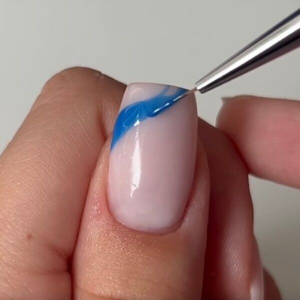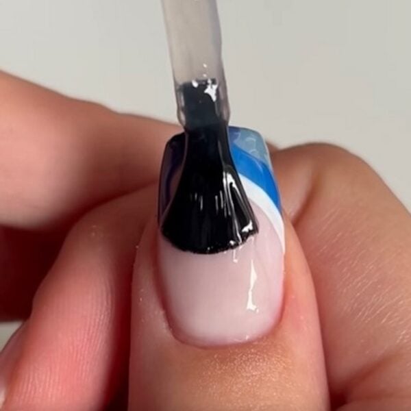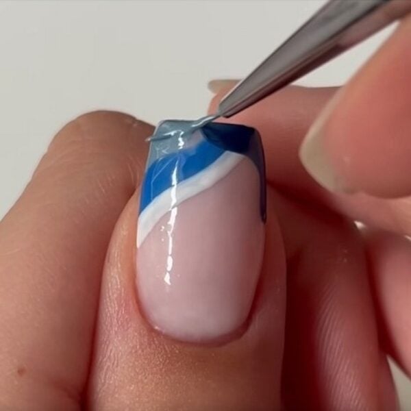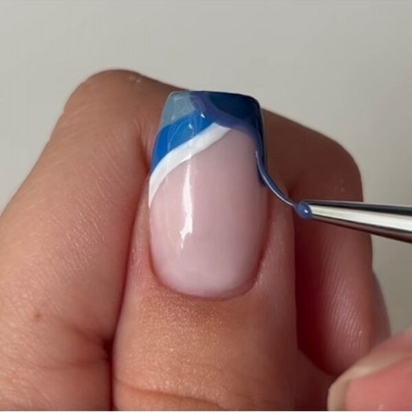 Finish with the final blue tone to complete the French tip and cure. Aimee has used Hema Free Gel Polish in Sky Scraper.