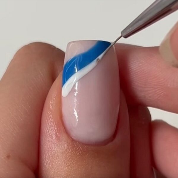 Using the Glitterbels Fine Liner Brush, apply the next shade below the previous in a similar thin, wavy line, and cure. Aimee has used Hema Free Gel Polish in White.
