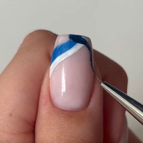 When cured, layer the third blue shade across the previous lines, creating a criss-cross point in the middle. Cure. Aimee has used Hema Free Gel Polish in Noble Navy.
