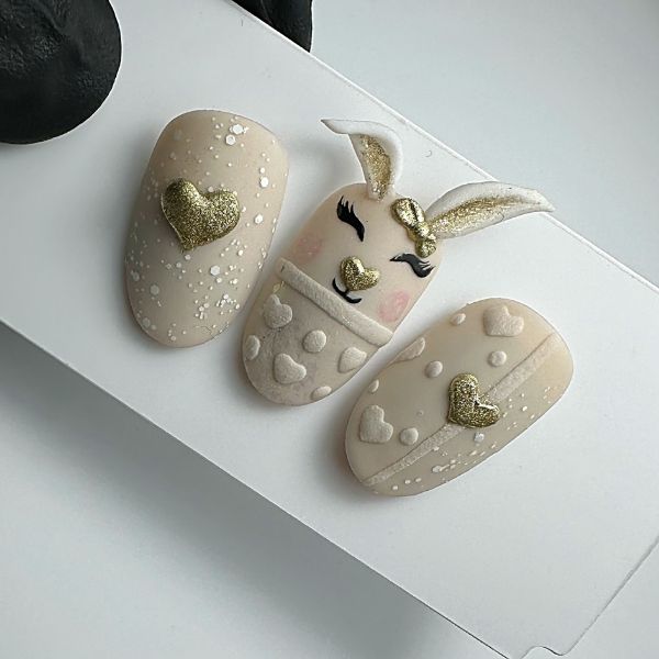 Paint a love heart onto the nail using a gold gel or acrylic paint, to create the bunny's nose.