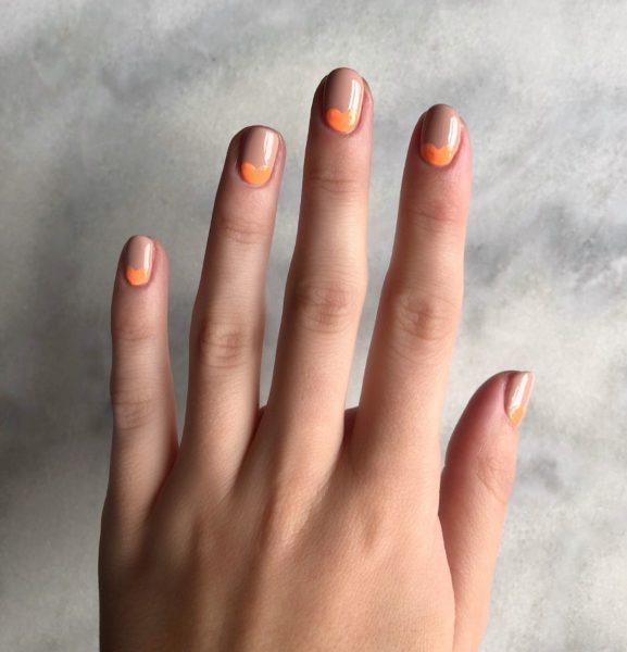 Mix together a small amount of Gellux Orange-A-Peel and Gellux Peach Perfect to get the perfect shade for the pumpkin, create a ‘squashed heart shape’ at the bottom of the nail and cure.