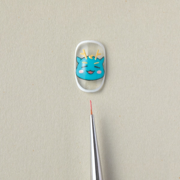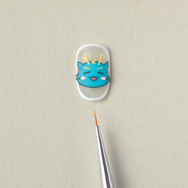 Draw horns, eyebrows and hair using a yellow gel colour and cure.