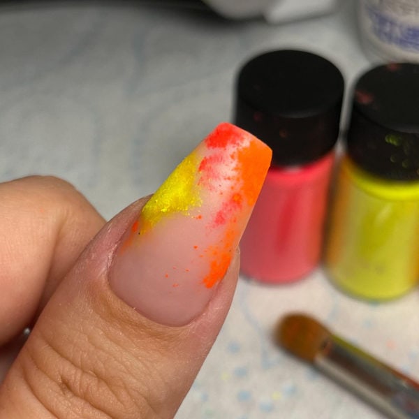 Apply Gelish Matte Top It Off, cure and then apply neon pigments over the nail.