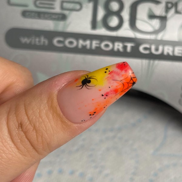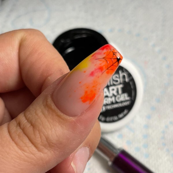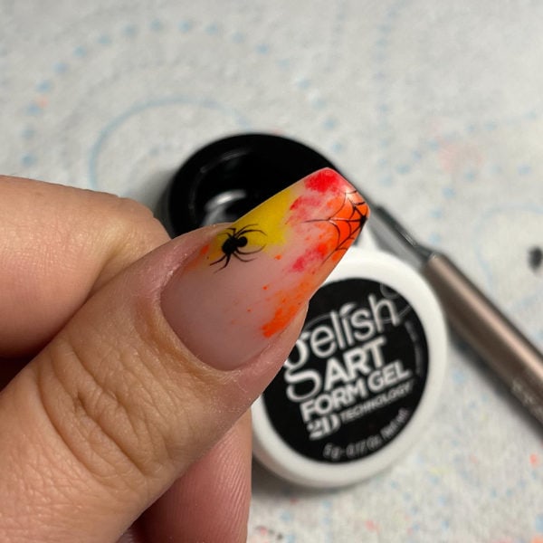 Using Gelish Art From Gel in Essential Black, create a spiders web from one corner and cure.
