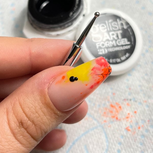 Still using an Art Form Gel with a dotting tool, add two black dots which will form the body of the spider.