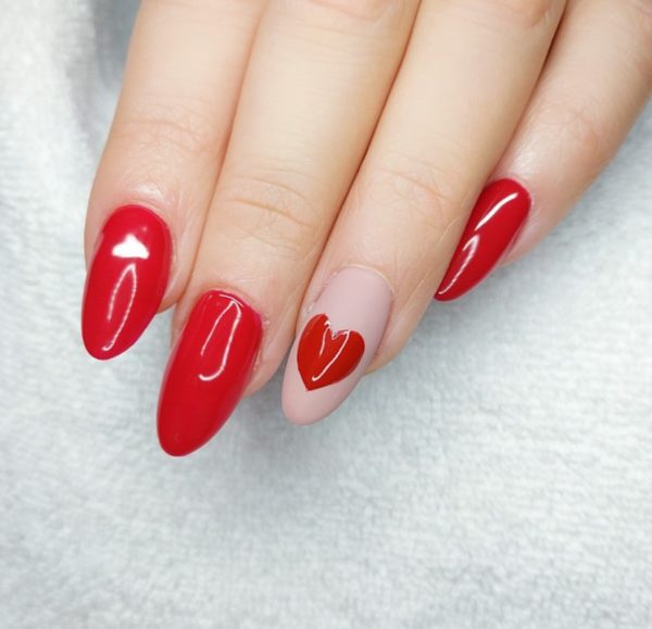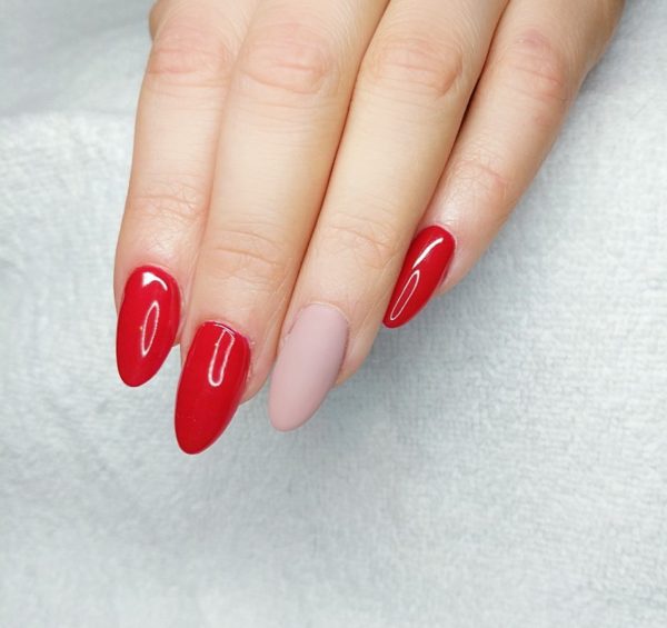 Prep and shape the nails. Paint two coats of your chosen red Gelish Soak-off Gel Polish shade, curing in between, and complete with Gelish Top It Off top coat. Cure. On the ring finger, paint two coats of a nude Gelish Gel Polish shade, curing in between, followed by Matte Top It Off.