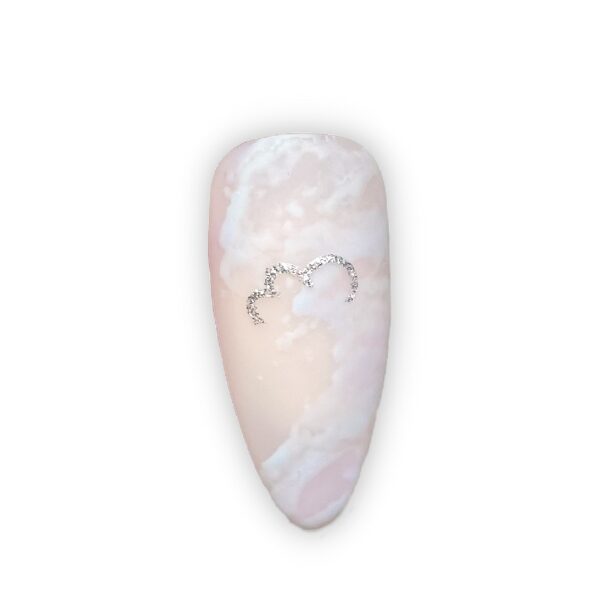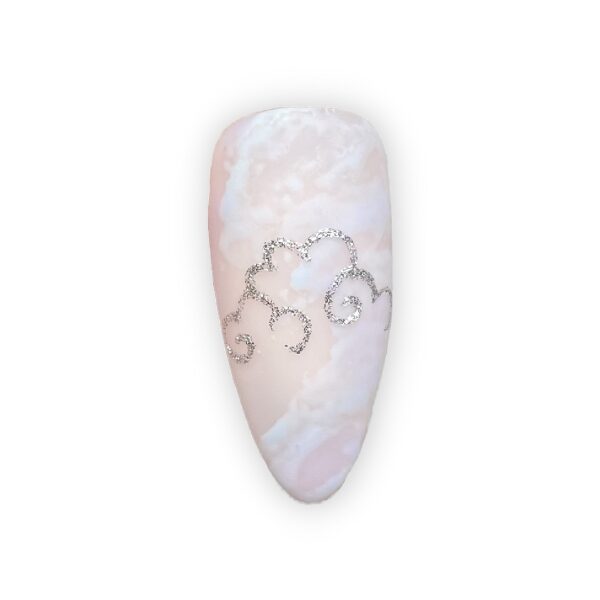 Using silver gel paint and a fine detail brush, add a cloud-shaped line in the centre of the nail, to create the top cloud, and cure. Casey-Leigh used shade, Silver Slippers.