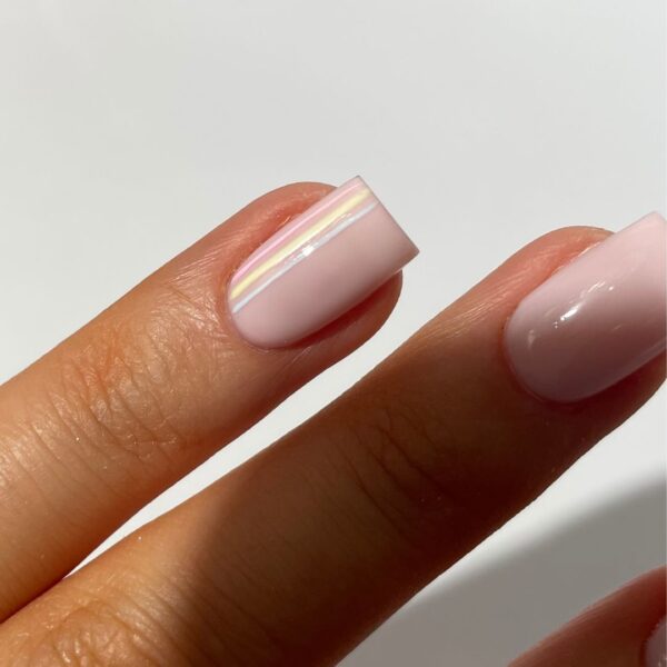 Prep the nails and apply All-In-One BIAB™ in NU05 as a base. Cure. Use the Liner 02 Brush and pastel Gel Polishes: Double Denim, Carrie’s Cosmo and Banana Split, to paint three vertical, off-centre lines on the ring finger. Cure after each application.