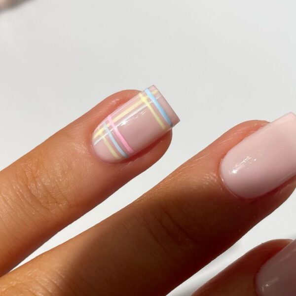 Overlap the vertical lines with horizontal additions across the top and bottom of the nail to create a pastel plaid design. Cure after each application.