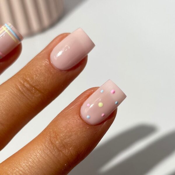 Using the same pastel Gel Polishes, create a minimal polka dot design on the index finger. Evenly space the dots over the nail using the Dotting 01 Tool. Cure.