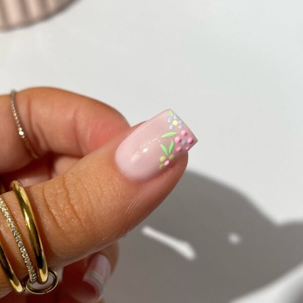 Use the Dotting 01 Tool and pastel Gel Polishes to create simple floral shapes at the tip of the middle fingernail. Cure after each application.