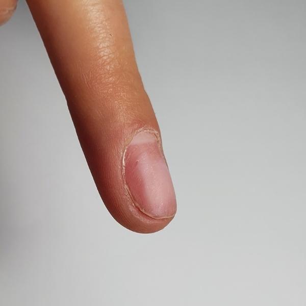 Extend the nail using Glitterbels Core Acrylic Powder in Sugared Almond, then using a 180-grit file, shape the smile line.