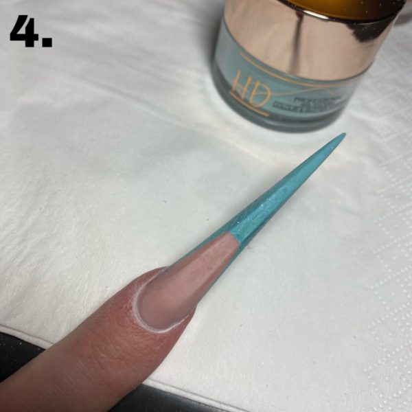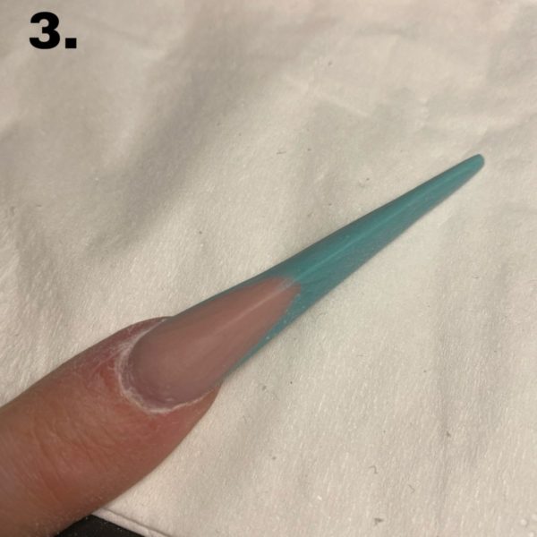 Using the reverse application, apply HD Pro Nails Dusty Rose to create an extended nail bed with straight sides and a flat end. It should be like a coffin-style shape.