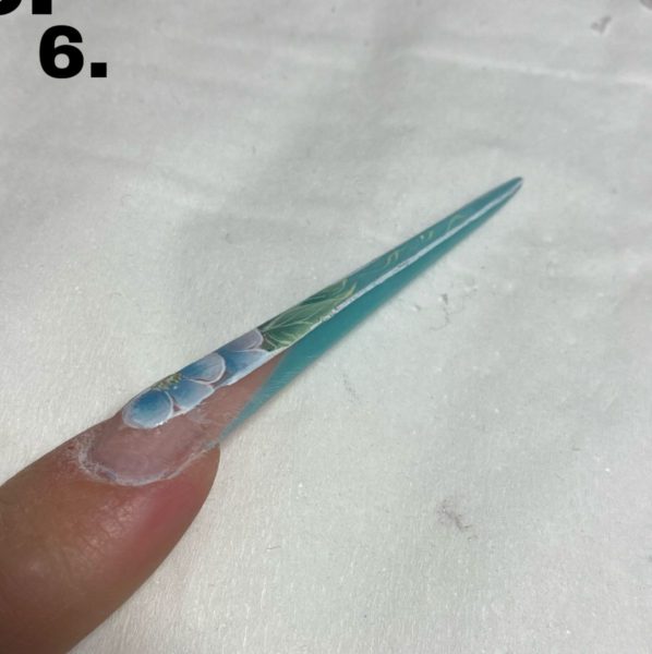 Add art to the flat top of the nail using HD Pro Art Gel paints and HD mini one stroke brush. Finish the nail with HD Pro Shine It! No Wipe Top Coat along the sides and cuticle end. Cure.