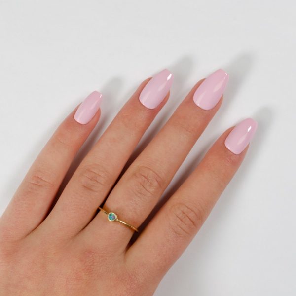 Prep and shape the nails in a subtle coffin shape. Apply base coat and two coats of iZ Beauty of London Gel Effect Nail Lacquer in Lily Romance. Allow to dry thoroughly. If using gel, remove the inhibition layer after curing.