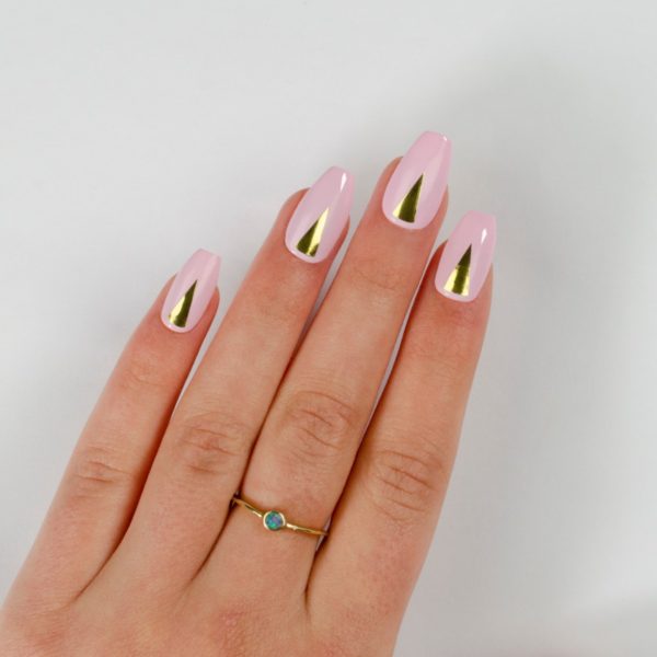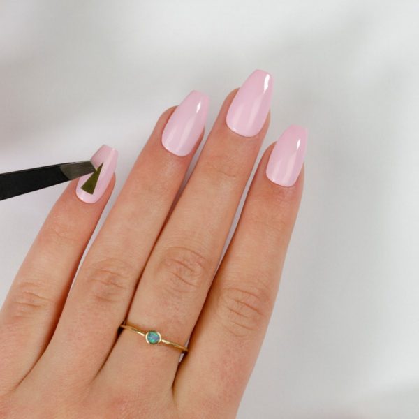 Carefully peel the self-adhesive Gold Triangle decal from the iZ Beauty of London Deco iT sheet using a pair of tweezers and place in the centre of the nail slightly away from the cuticle area.
