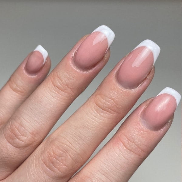 On each finger, paint a French tip over your chosen base colour. Use a liner brush and Halo Gel Polish in French White to do so. Cure.