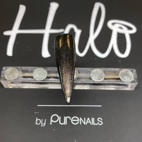 Prep the nail, apply Halo Gel Polish Base Coat and cure. Apply Halo Gel Polish in Black, cure for 30 seconds and repeat with a second coat. Apply one coat of Halo Gel Polish Sparkle Top Coat and cure for 30 seconds.
