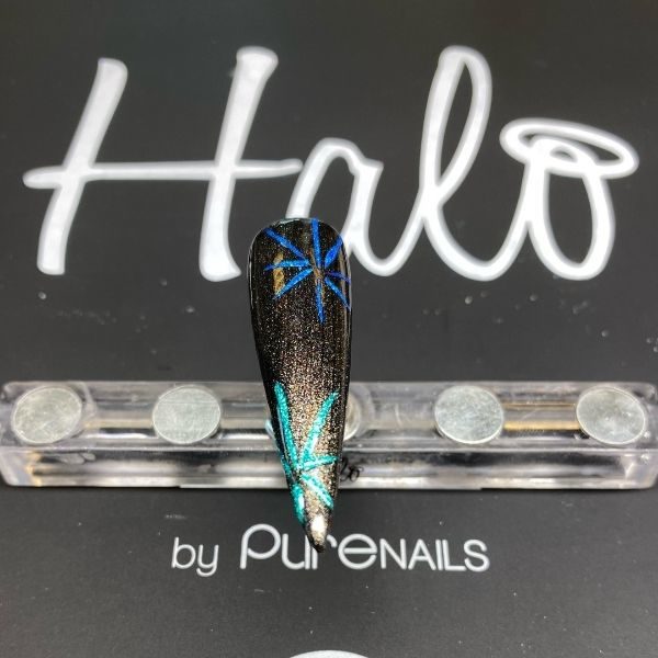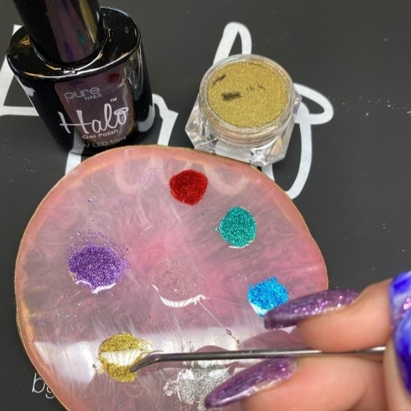 Using a variety of Halo Create Chrome Powders, mix each colour on a mixing palette with a small amount of Halo Gel Polish Base Coat. This will make beautiful chrome paints.