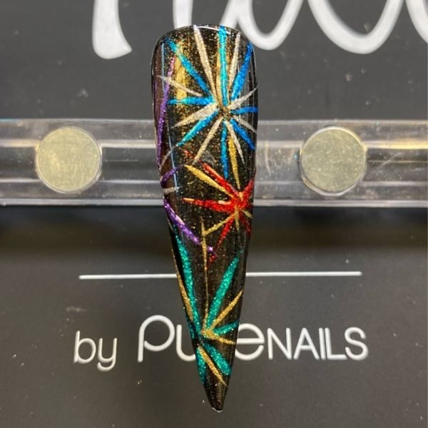 Using a striping brush, paint lines with the chrome paints (except for the gold and silver colours) to create firework designs. Flash cure in between the colours to avoid them mixing.