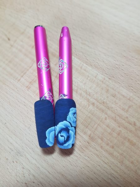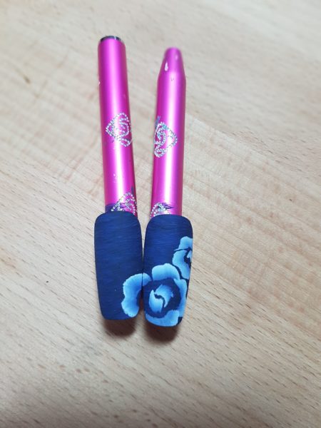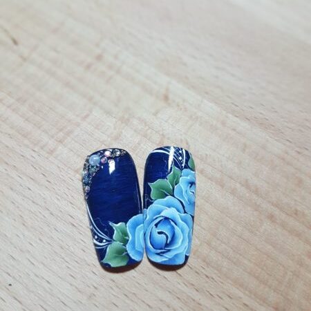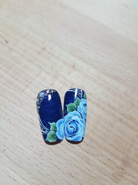 Paint the background with a dark navy acrylic paint. If creating this design on a client's nail, use a gel colour instead.