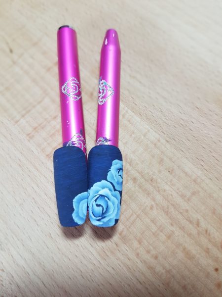 Using white art gel and a size 0 brush, highlight the petals and leaves. Paint the lines a tiny bit thicker in those areas where the petals are folding in. Add extra detail to make the design more interesting. Cure fully. Don't top coat.