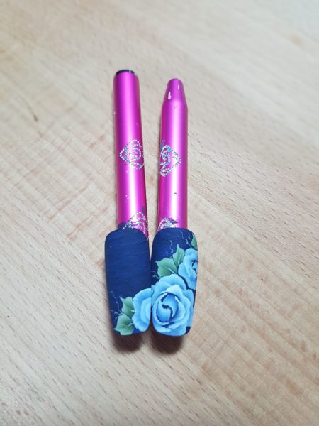 Pick up white and dark blue (two thirds blue and one third white) on a one stroke brush; blend the colours on your hand. Using the one stroke technique, paint two roses - one bigger and one smaller - starting with the outside petals and the centres.