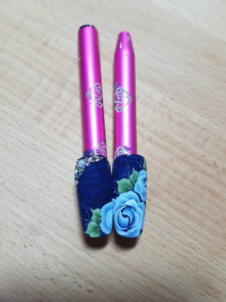 Apply no wipe top coat and place crystals of various sizes in the empty corner of the design. Cure fully.