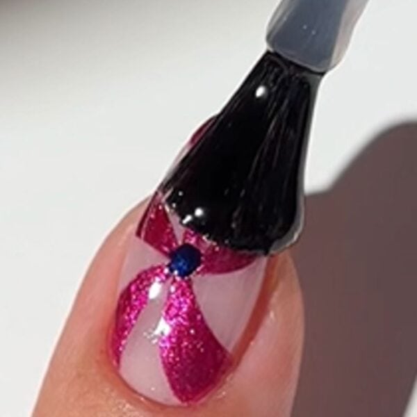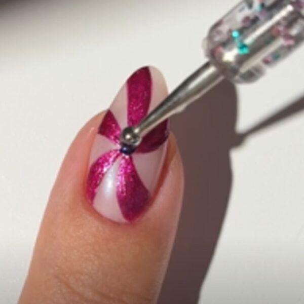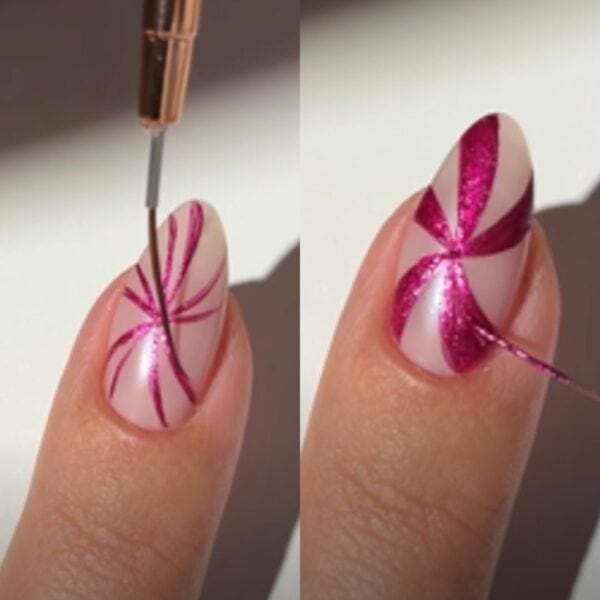 On the index fingers, use a bright pink metallic polish and thin nail art brush to paint curved lines from the centre of the nail to the edge. Then, fill in the shapes created to form a candy swirl design.