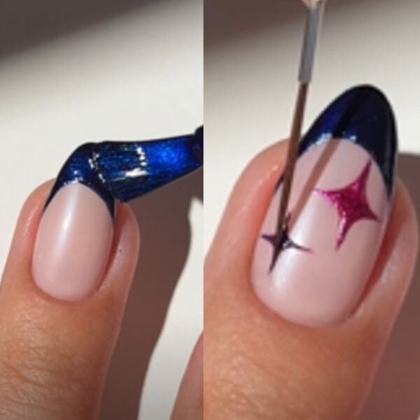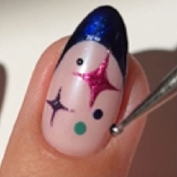 Using the dark blue shimmer polish, create French tips on the middle fingers. Once dry, use the bright pink metallic polish and a thin nail art brush to create a starburst shape just below each French tip. Then, using a dark purple créme polish, add a smaller starburst towards the lower left of the nail.