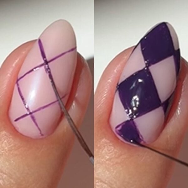 On the ring fingers, use the dark purple créme polish and a thin nail brush to paint two parallel lines diagonally from each side of the nail. Fill in every other diamond shape to create a checkerboard look.